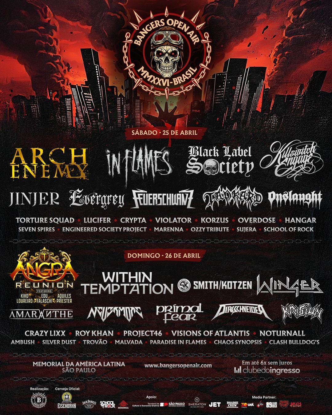 O Bangers Open Air 2026 tem line-up de peso em sua próxima edição que será realizada nos dias 25 e 26 de abril no Memorial da América Latina, em São Paulo (SP). Alguns dos primeiros nomes divulgados foram BLACK LABEL SOCIETY, PRIMAL FEAR, TANKARD, FEUERSCHWANZ, KORZUS, NEVERMORE, PROJECT46, WITHIN TEMPTATION e CRYPTA. Entre as atrações divulgadas estão AMBUSH, KRISIUN, KILLSWITCH ENGAGE, JINJER, e o tão requisitado pelo público IN FLAMES. Também foram confirmadas as presenças de WINGER, ONSLAUGHT, EVERGREY, AMARANTHE, DIRKSCHNEIDER, LUCIFER, CRAZY LIXX, ROY KHAN, SEVEN SPIRES, VISIONS OF ATLANTIS, SILVER DUST, e SMITH/KOTZEN, de Adrian Smith (Iron Maiden) e Richie Kotzen.