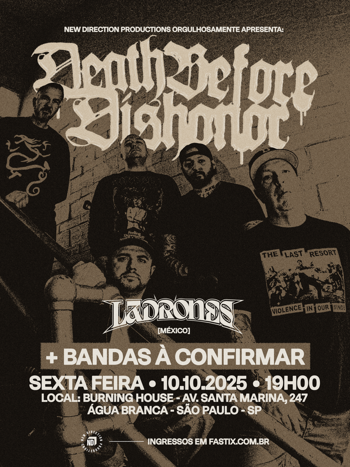 No próximo dia 10 de outubro, São Paulo recebe um encontro inusitado e intenso: os norte-americanos do Death Before Dishonor e os mexicanos do Ladrones dividem o palco da Burning House, junto às bandas Worst e Odeon. A apresentação é produzida pela New Direction Productions e promete ser um verdadeiro encontro do hardcore underground mundial. Confira as informações abaixo sobre os ingressos.