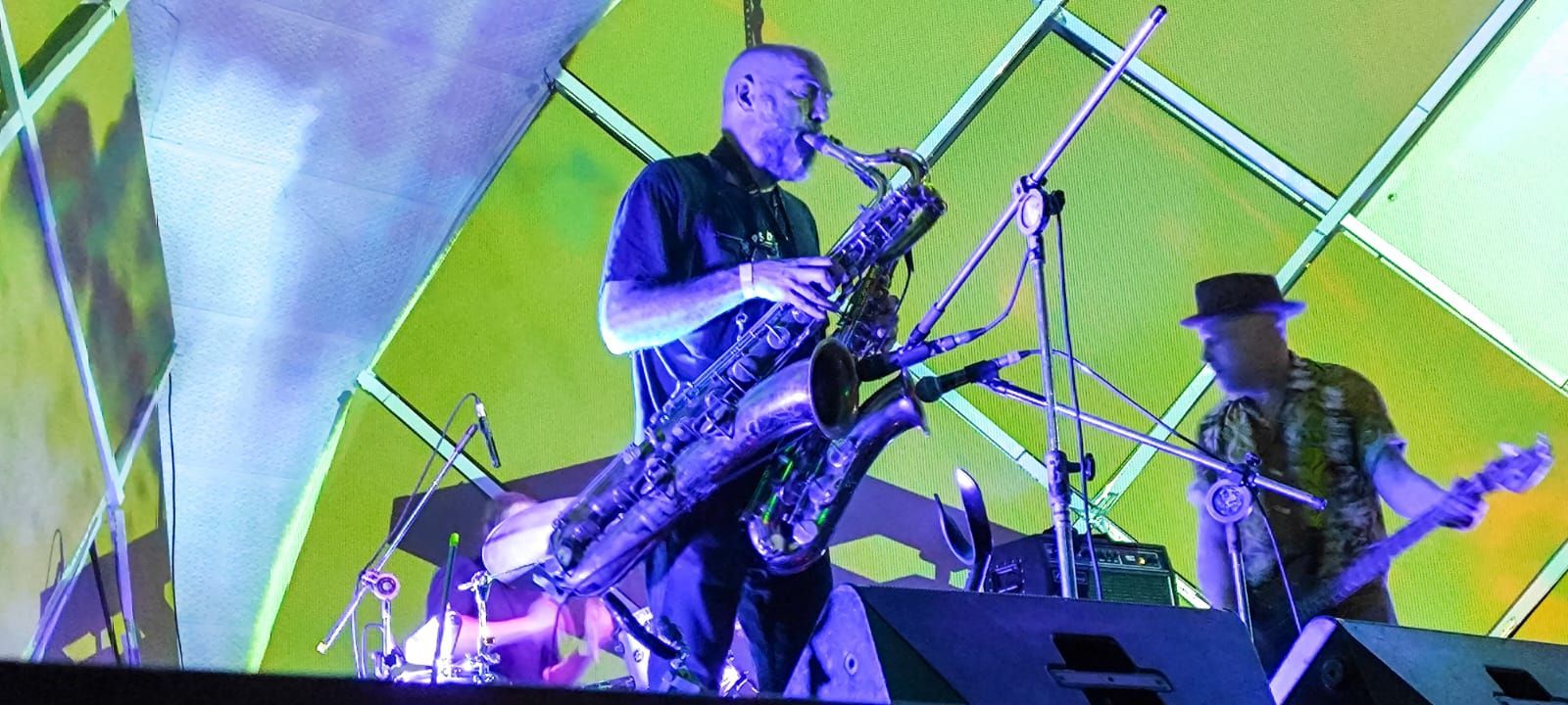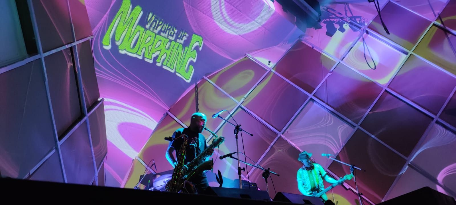 E foi exatamente nesta pegada, aos gritos do público, que o trio se instalava e se preparava às 22h, adiantando-se também do horário previsto original, começando a noite com Have a Lucky Day, música do Morphine e que, para todos ali, mais se retratava como uma “Lucky Night”. Afinal, se iniciava uma performance há muito antecipada e que se destaca dentro do rock e seus subgêneros. Com o logo da banda em animação tremeluzindo no topo do teto e imagens psicodélicas sendo espelhadas pelas paredes, o som imediatamente somado à experiência visual já dava uma amostra de uma jornada lisérgica que tomaria conta dos corpos e mentes de todos nós. Outro inegável elemento, fosse você um conhecedor ou não da banda, era a imponência do saxofone barítono misturado ao baixo slide de duas cordas e às batidas lentas e cadenciadas da bateria, que trazem uma complexidade sonora quase indescritível sobre o quão hipnotizante é tal experiência.